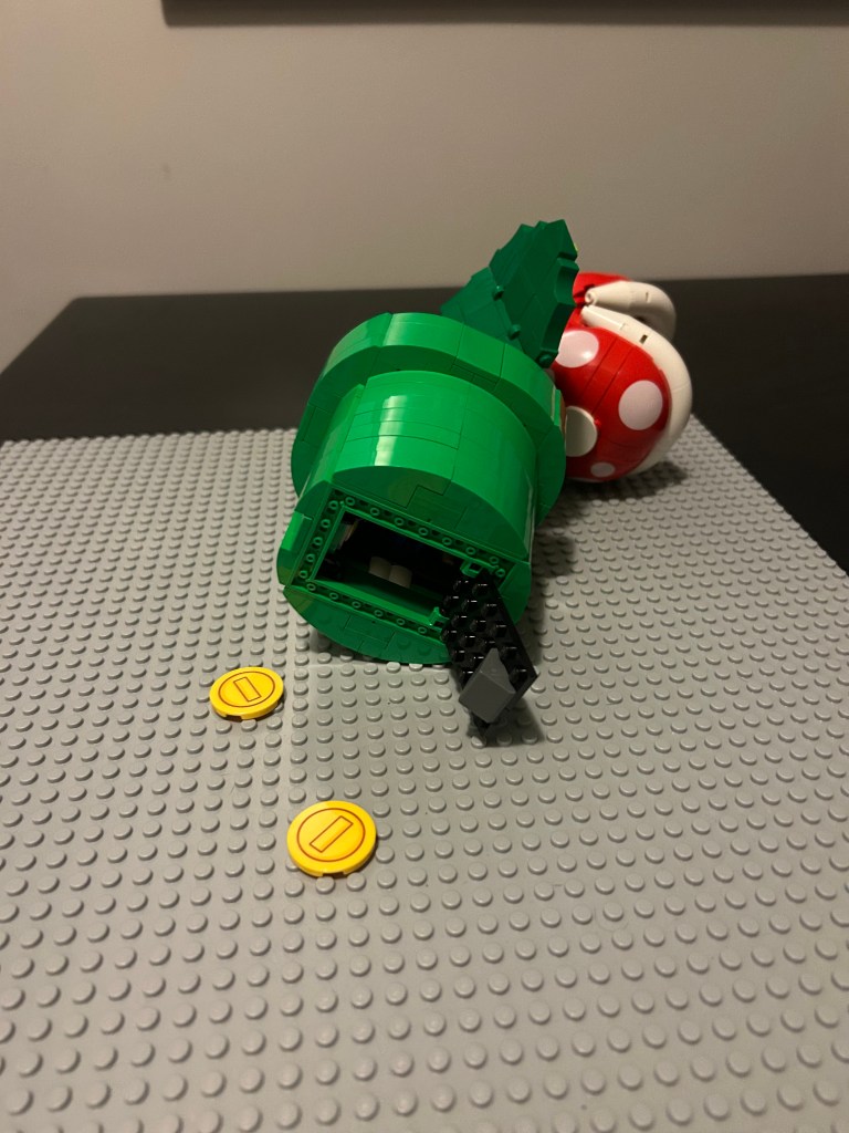 The elements of SNOT in the pipe/pot, the trap-door base, and curved-chunky bricks for the lips and domed head made for a unique build experience. While most Botanical themed sets lack in Playability, the Piranha Plant’s fluttering petals and chomping jaw pose a thread to your minifigures. And the best Playable element is the trap door at the bottom of the pot which dispenses included 2 included coins.
