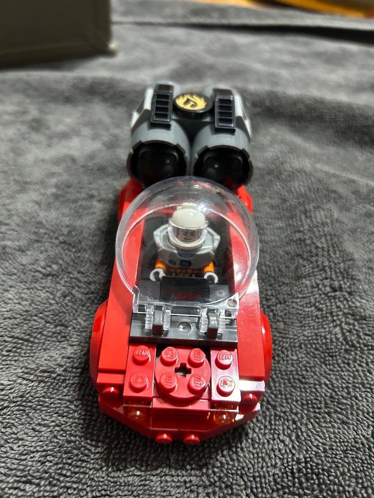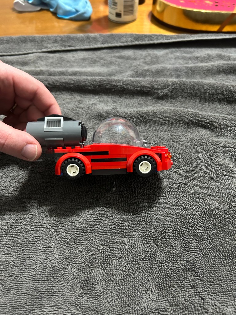 Once they dried I separated them by color decided to build something with only the pieces I bought that day. I was excited to see enough car parts to build a 9/10ths of a super car from a City set over 10 years old. The missing pieces include the parts to make front and rear spoilers, as well as some detailing on the rear engine. To compensate, I added 2 oversized jet engines, and a bubble glass cockpit. I think the MOC is fun, silly, and imaginative. The price was certainly right.